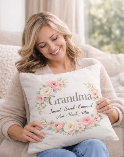 Warm, morning light spills across a kitchen table. This glossy ceramic mug holds more than coffee — it holds quiet gratitude and the soft smile that comes when someone calls you “Grandma.” A delicate floral wreath wraps around the name, with space for loved ones’ names beneath, making each sip feel personal and remembered. The bright print stays vivid through daily use, and the comfortable C-handle sits naturally in the hand while you read cards or swap family stories. Use it for slow weekend mornings, cozy phone calls with grandchildren, or as a thoughtful addition to a Mother’s Day or birthday morning routine.